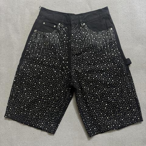 Ropa de calle personalizada 100% algodón All Over Crystal Acid Wash Zipper Fly Distressed Rhinestone Baggy Jorts Denim Jeans Shorts para hombres
