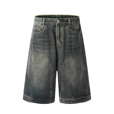 Pantalones cortos de mezclilla lavados Patchwork para hombre y costuras brillantes para hacer pantalones cortos de pierna ancha rectos sueltos viejos